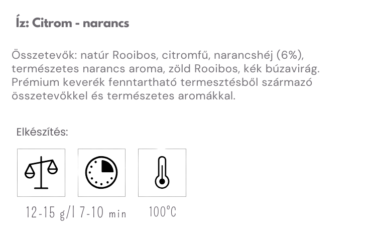 A narancsos rooibos tea egy különleges teakeverék, amely a rooibos természetes édességét citrusos aromákkal gazdagítja. Az „Édes napsugár” nevű rooibos keverék a klasszikus rooibos és a zöld rooibos harmonikus alapjára épül, amelyet citromfű, narancshéj és természetes narancs aroma tesz még gazdagabbá.