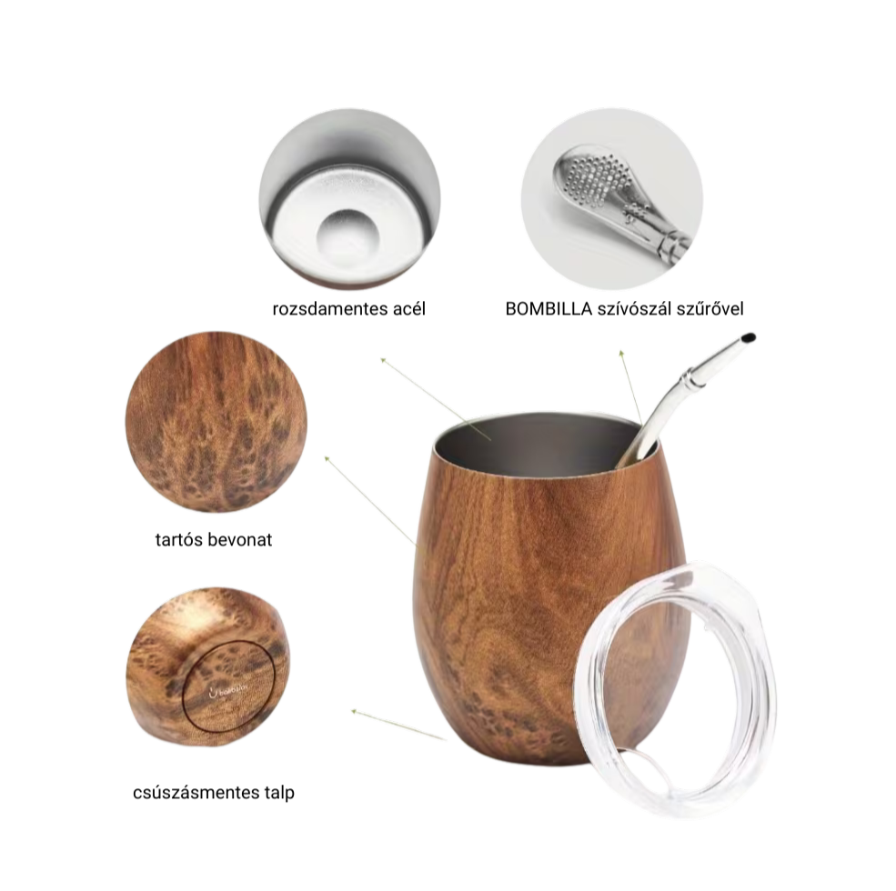 A yerba mate tök bombillával ideális eszköz a hagyományos mate tea fogyasztásához. A praktikus fedél és a bombilla szívószál kényelmes használatot biztosít.